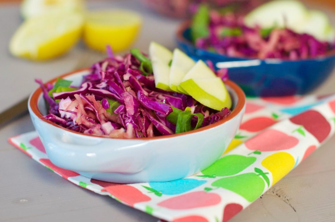 Klasicky se zelný salát u nás doma vždy dělal se sladko-kyselou zálivkou, a tak jsem přemýšlela, jak ho udělám. A pak mi do oka padlo zelené jablko na míse s ovocem. K tomu jsem hledala nějakou bylinku na zvýraznění chuti, ale nic jsem doma neměla kromě natě z jarní cibulky.