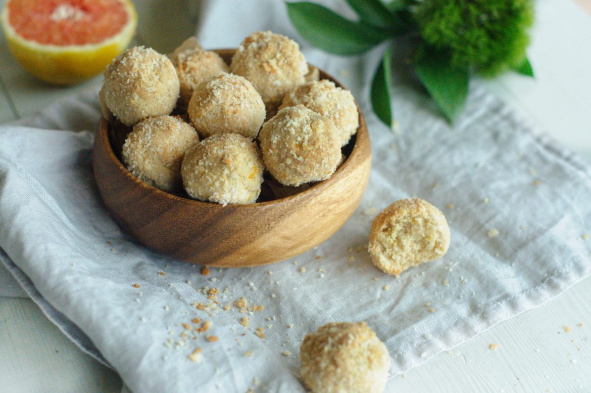 Připravte si plech a vyložte ho pečícím papírem. Troubu předehřejte na 135°C. V misce smíchejte mletí mandle, kokos a kokosovou mouku. Přidejte kokosový olej, sůl, a promíchejte. Poté přidejte med, kůru z pomeranče, pomerančovou šťávu a rukama vypracujte těsto. Bude se vám zdát, že je těsto dost sypké, ale když budete rukama mačkat bude se těsto lehce formovat asi 2-3 cm velké kuličky, následně je obalte ve strouhaném kokosu a pokládejte na připravená plech. Dle velikosti jich vytvoříte 10-16. Dejte péct do trouby na 25-30 minut. Skladujte v lednici.