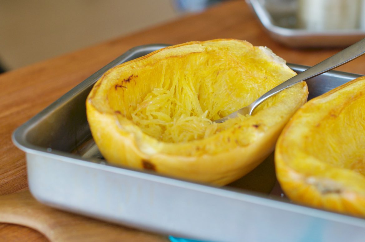 Nechte péct při teplotě 170 °C asi 30-40 minut, dokud nebude dýně uvnitř měkká. Pak pomocí vidličky upečenou dužinu vyndejte a máte krásné, pravidelně vypadající nudle, které se dají použít jako nudle klasické.  Ať už do polévky nebo na další rychlé recepty jako je třeba tento nebo tento.