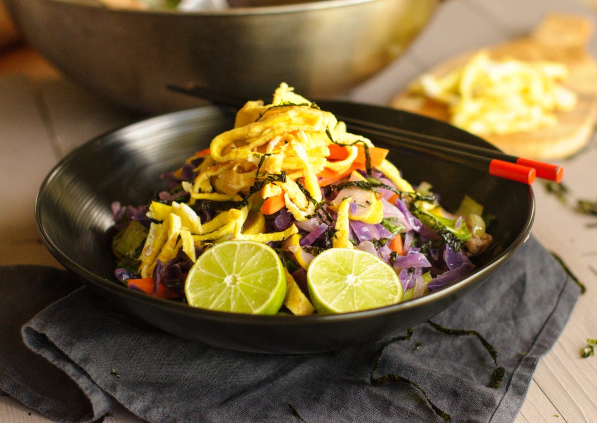 Až bude zelenina hotová, naporcujte na talíř, navrch dejte vaječné nudle, přidejte trochu čerstvého koriandru a pokapejte čerstvou šťávou z limetky.