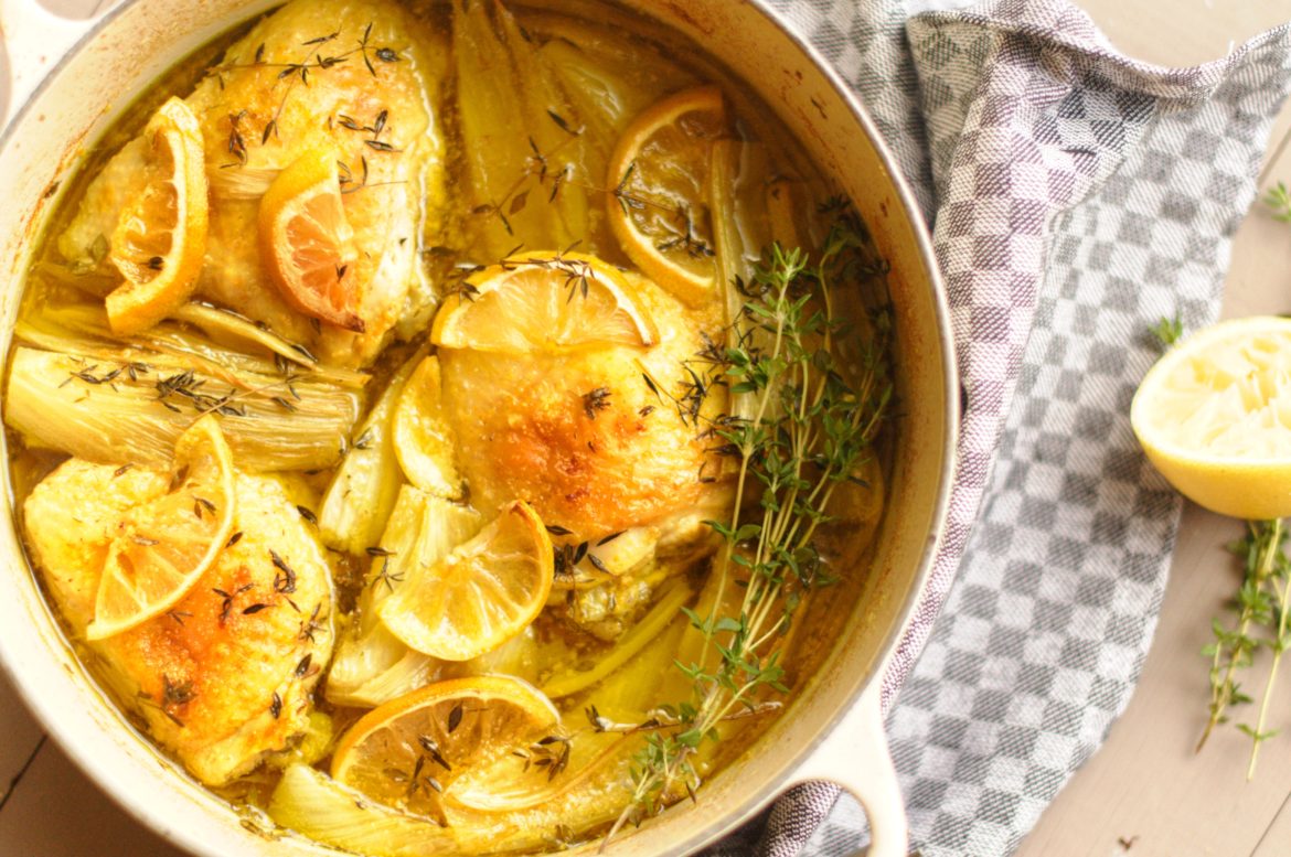 Do připraveného pekáče dejte nakrájený fenykl, maso včetně vývaru, přidejte plátky pomeranče a citronu, můžete přidat i více tymiánu a lehce dosolit.