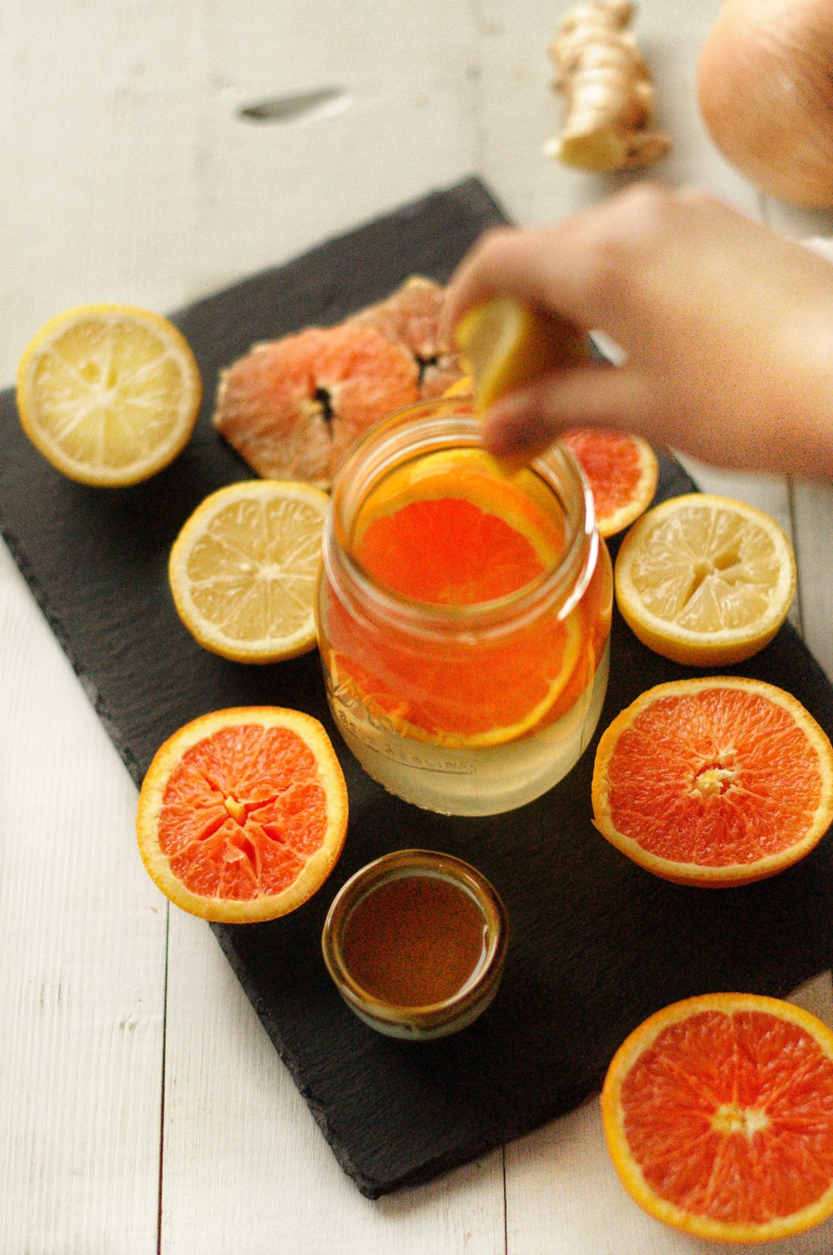 Do hrnku nalijte vodu a dejte na sporák. Oloupejte česnek, cibuli a zázvor a nakrájejte na větší kusy. Přidejte do hrnku s vodou a pomalu nechte přivést k varu, asi 5 minut povařte. Poté vypněte, zakryjte pokličkou a nechte asi 15-20 minut louhovat. Takto můžete nechat a vždy odebrat hrníček, do kterého vymačkáte půlku nebo celý pomeranč, citron dle chuti a přidáte lžičku medu (ten můžete vynechat) Čaj servírujte teplý, ale ne horký, ať neponičíte vitamíny v citronu a pomeranči a případně i medu.