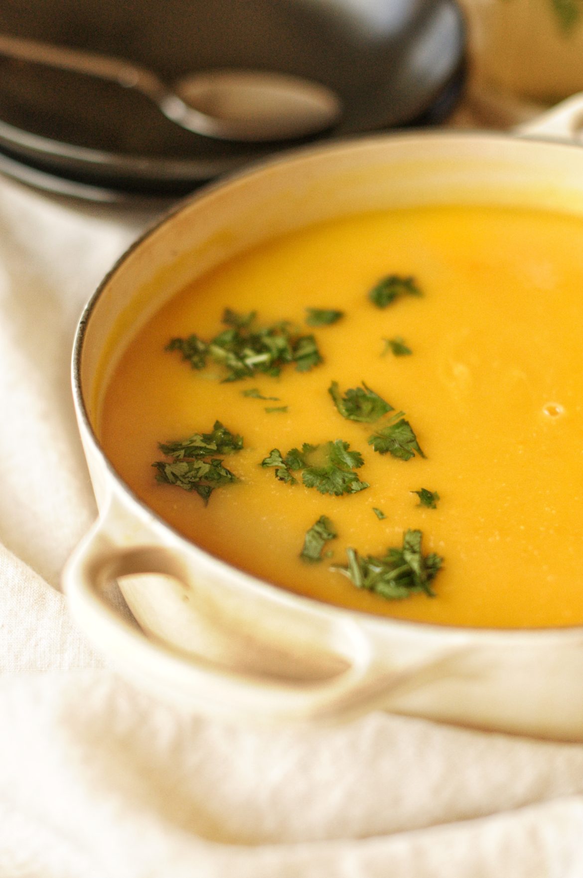 Předehřejte si troubu na 175 °C, a připravte si pekáč s víčkem nebo hrnek, který se může dávat do trouby. Skleněné zapékací misky fungují skvěle. Dýni oloupejte, to i v případě že budete používat hokkaidó, odstraňte semínka a nakrájejte na přibližně stejné kusy. Cibuli a česnek oloupejte a nakrájejte na vetší kusy, stejně tak jako zázvor a kurkumu. Takto připravenou zeleninu dejte do misky/hrnku zalijte vývarem, osolte a opepřete. Promíchejte a zakryjte, vložte do trouby a nechte péct asi 1,5 až 2 hodiny, dokud nebude veškerá zelenina dokonale měkká. Poté vyndejte a můžete rozmixovat ručním mixérem do hladké, krémové polévky, případně můžete nechat i tak jak je. Podávejte s čerstvým koriandrem a zakysanou smetanou (pokud tolerujete)
