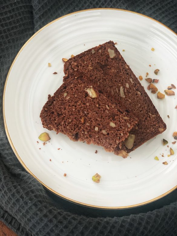 Předehřejte si troubu na 180°C. a připravte si formu na chleba o velikosti asi 10x22 cm. Předem namočené kešú slijte, propláchněte čistou vodou a vložte do misky, přidejte 4 žloutky. Pomocí ručního mixéru rozmixujte ořechy a žloutky dohladka, ale nemusíte se bát, pokud některé kousky zůstanou větší. Postupně do těsta vmíchejte kakao, jedlou sodu, med (pokud používáte) a kokosové mléko. Misku s těstem nechte stranou a z bílků si v samostatné nádobě vyšlehejte sníh, který následně pomalu již jen lžicí nebo špachtlí vmíchejte do těsta, dokud se bílky a těsto dokonale nespojí. Těsto nalijte do připravené formy a uhlaďte, posypte nasekanými pistáciemi nebo jinými ořechy. Dejte péct na 50 minut. Nechte vychladnout, než budete krájet. Pokud máte chuť na extra čokoládovou nálož, můžete chleba polít čokoládou.