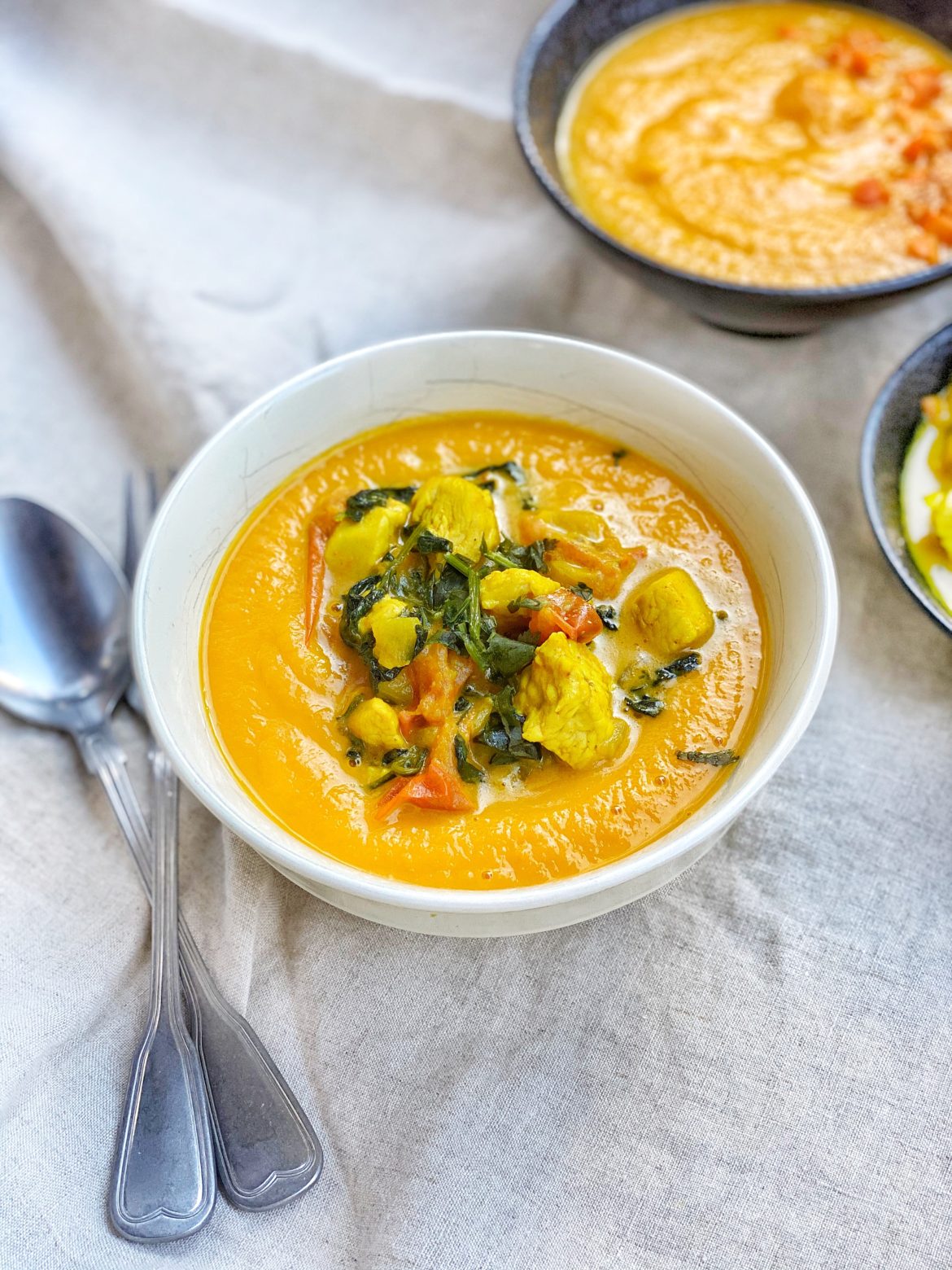 Maso si nakrájejte na menší kousky, cibuli nadrobno nebo můžete klidně nechat na plátky. Zahřejte si pánev a přidejte na ni tuk a cibuli, nechte cibuli za občasného míchání zesklovatět, poté přidejte maso, osolte, opepřete a maso k posypte kurkumou. Promíchejte a nechte maso pomalu restovat. Mezitím si nakrájejte rajčata na čtvrtky a propláchnete špenát. Až bude maso skoro měkké, přidejte špenát a rajčata, promíchejte, a nakonec přidejte kokosovou smetanu. Nechte dalších asi 10 minut pomalu vařit, aby se chutě krásně propojily. Pokud nemáte možnost sehnat kokosovou smetanu, můžete si koupit tučné kokosové mléko v plechovce (čtete složení, chcete, aby tam byl pouze kokos a voda) a nechte přes noc v lednici. Na povrchu se vám usadí smetana a tu můžete použít. Případně můžete přidat i plnotučné kokosové mléko. Servírujte s květákovou rýží případně jako já, s touhle úžasně jednoduchou kaší.