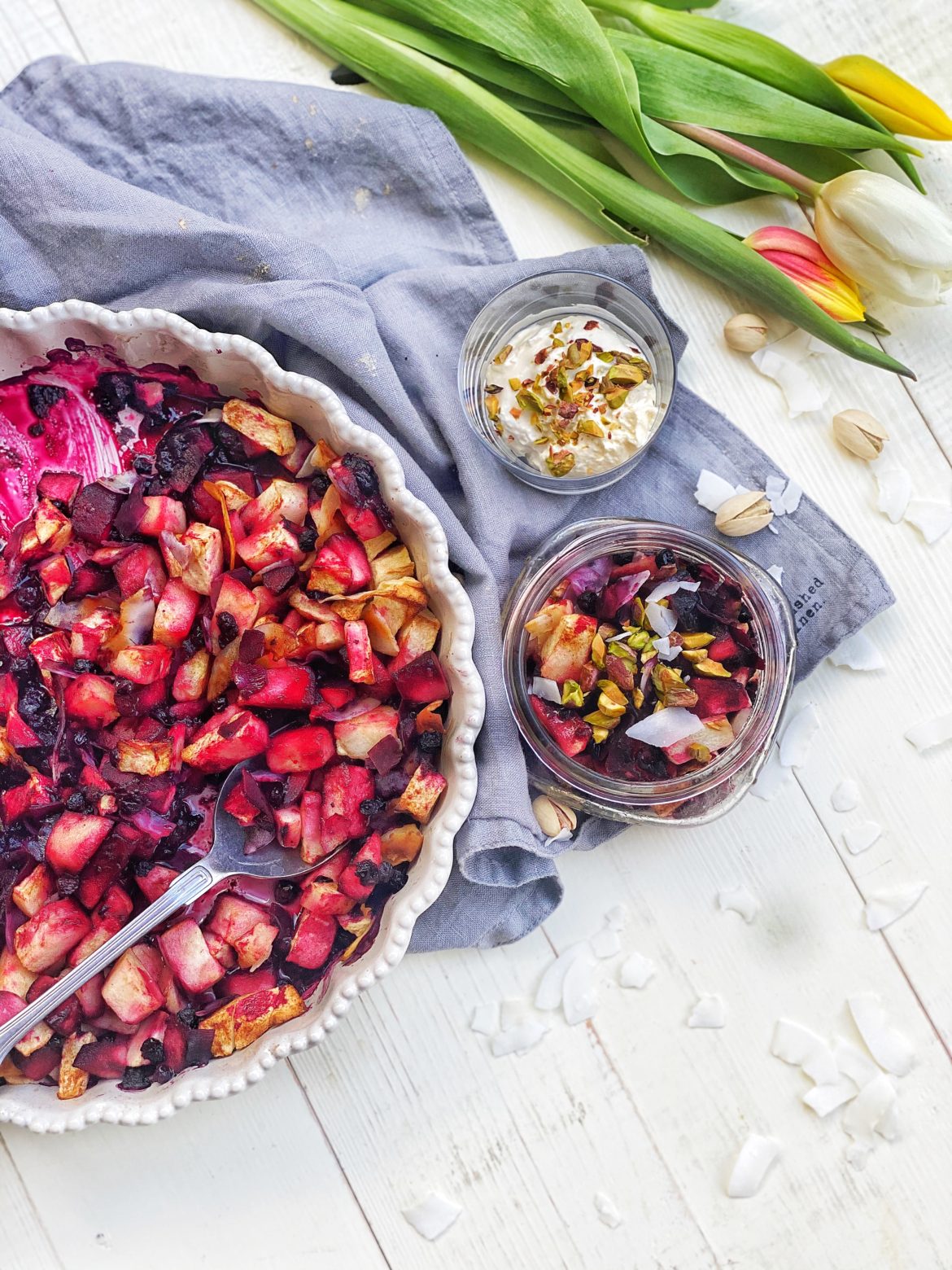 Místo borůvek můžete použít samozřejmě i jiné ovoce jako třeba rybíz nebo maliny. Já osobně mám nejraději jen pečená jablka, kromě kokosu můžete klidně přidat i jiné nasekané ořechy bud již do pečení, nebo až na ozdobu.