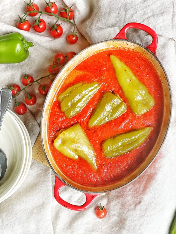 V zahraničí se nedají sehnat ty správné papriky, tyhle zelené papriky se slabou slupkou jsem viděla jen v Čechách, a proto jsme se do tohoto receptu nikdy nepustila. Přece jen to s kapií není ono.