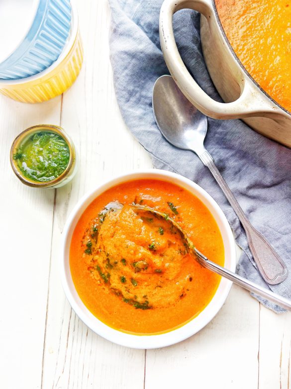 Předehřejte si troubu na 160 °C. Připravte pekáč a do něj vložte cherry rajčata. Na kousky rozporcovaný květák, mrkev nakrájenou na delší hranolky, papriky očistěné a nakrájené a široké plátky, cibule nakrájená na čtvrtky. Paličku česneku očistěte od vnější slupky, nahoře seřízněte a vložte do pekáče. Osolte, opepřete a pokapejte olivovým olejem. Dejte péct na 60 minut. Až bude zelenina pečená, přendejte ji do většího hrnce, pečený česnek vymačkejte ze slupky a zalijte vývarem a kokosovým mlékem. Pomalu nechte přivést k varu a povařte asi 25 minut. Ochutnejte a dosolte/opepřete dle chuti. Když se bude polévka vařit, připravte si bylinkový olej. Do nádoby dejte hrst nasekané petrželky nebo jiné byliny (třeba koriandr chutná skvěle) zalijte avokádovým olejem a rozmixujte do hladka. Až bude polévka hotová, rozmixujte ji do hladkého krému a servírujte s bylinkovým olejem, případně s domácí zakysanou smetanou.